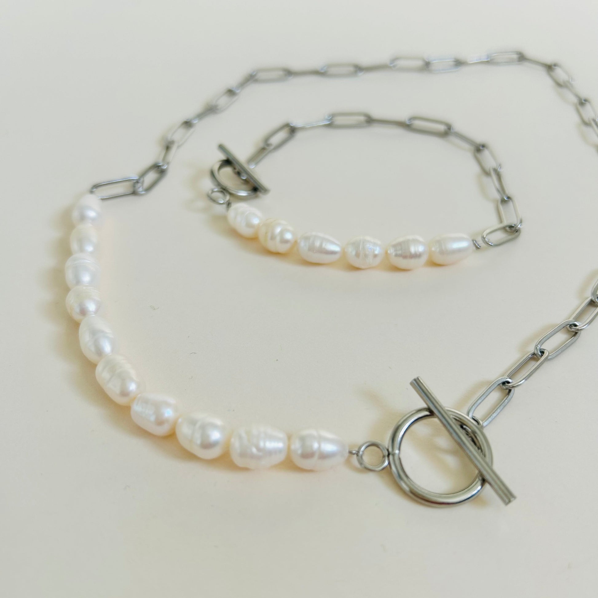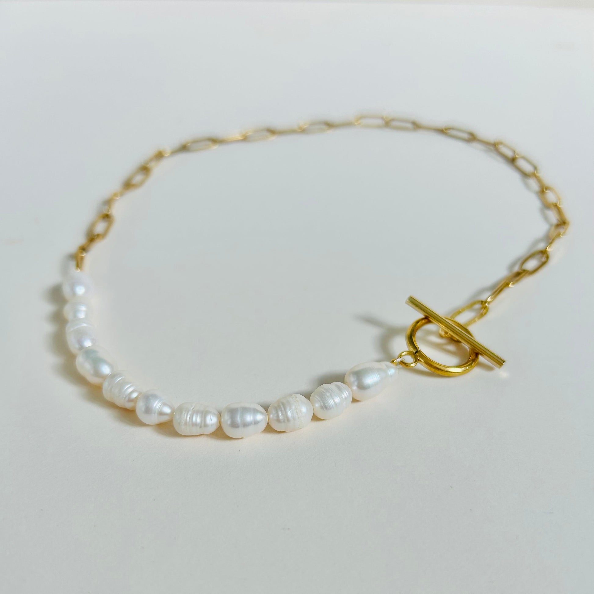 Set with elongated paper clip-shaped linked chain, each necklace is strung with 10 pearls & finished with a front facing hoop & bar clasp.